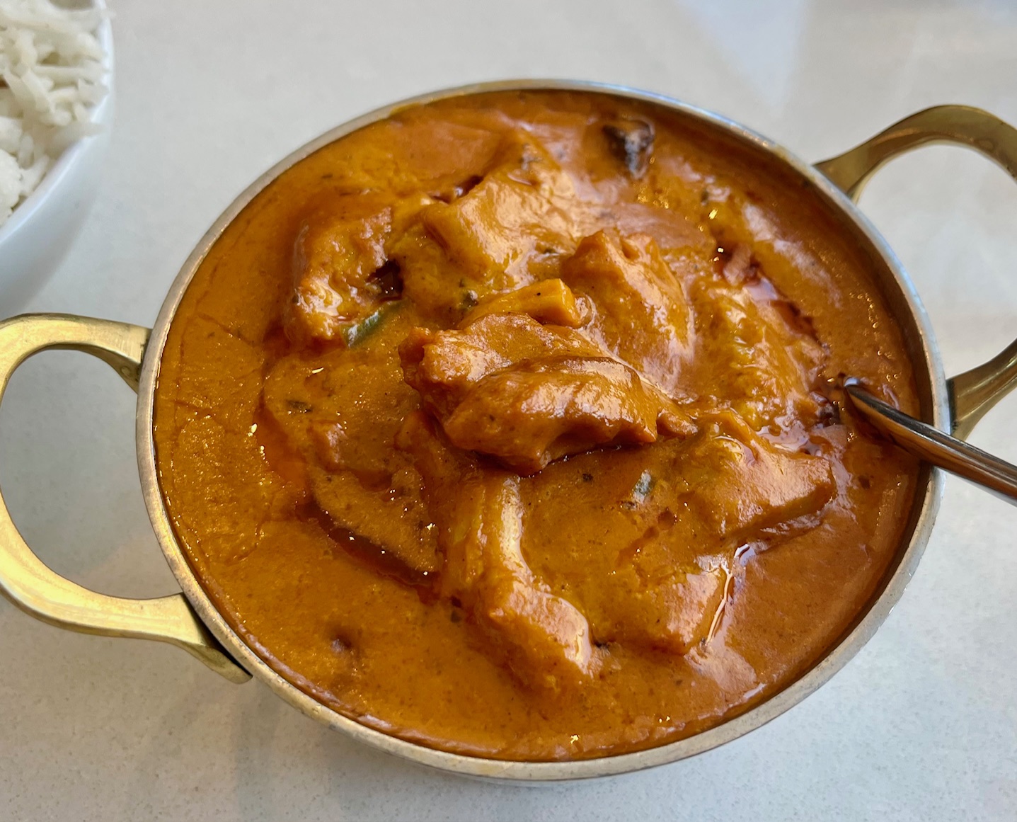 Another popular entrée is Lamb Shank Rogan Josh, a dish that originated in Kashmir. Lamb is seared, then simmered in a brown-red curry sauce flavored with browned shards of onion, garlic, saffron, Kashmiri chili and other spices. The lamb is fall-off-the-bone tender.